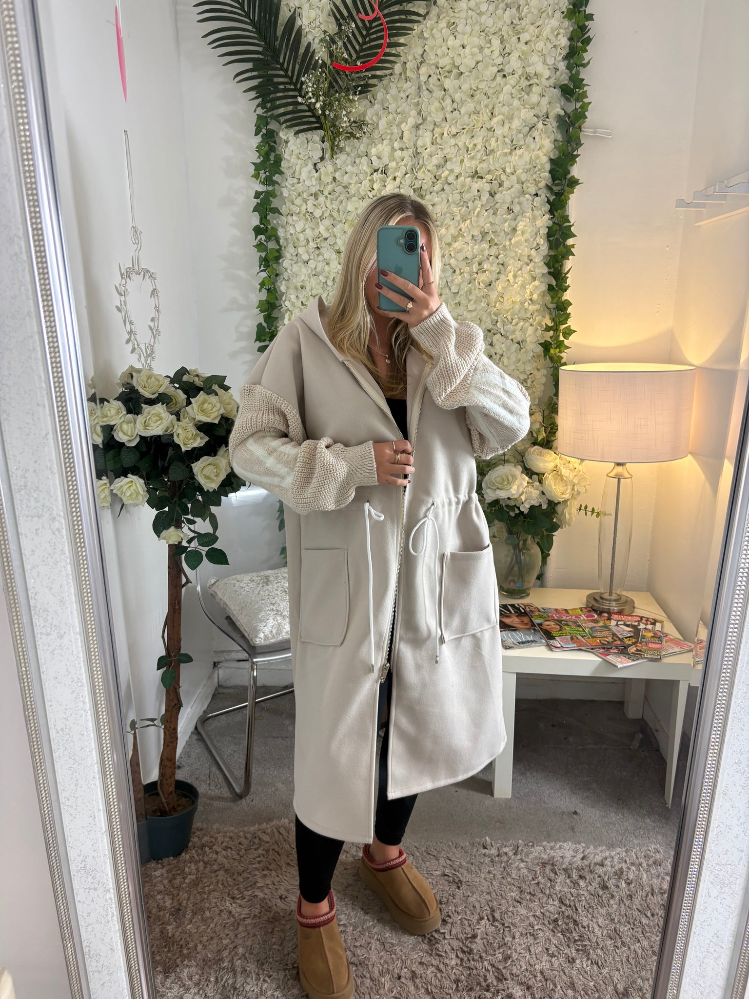 Fabulous one sized coat with stunning pocket and  detailed sleeves. Had pull in drawstring detail on the waist. Perfect to wear this winter!